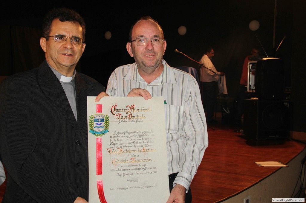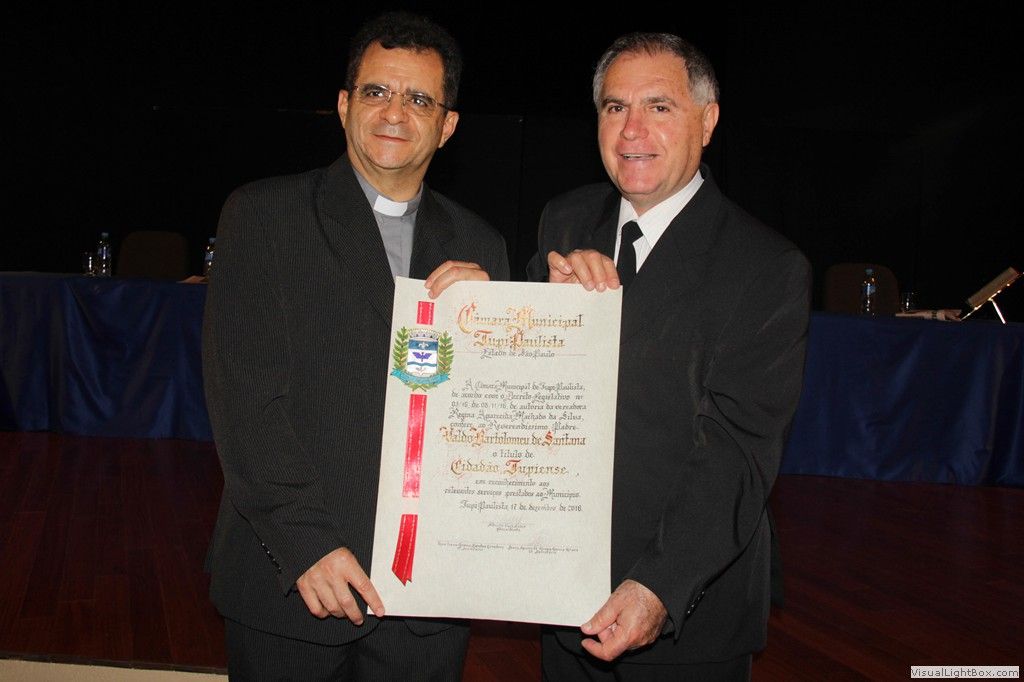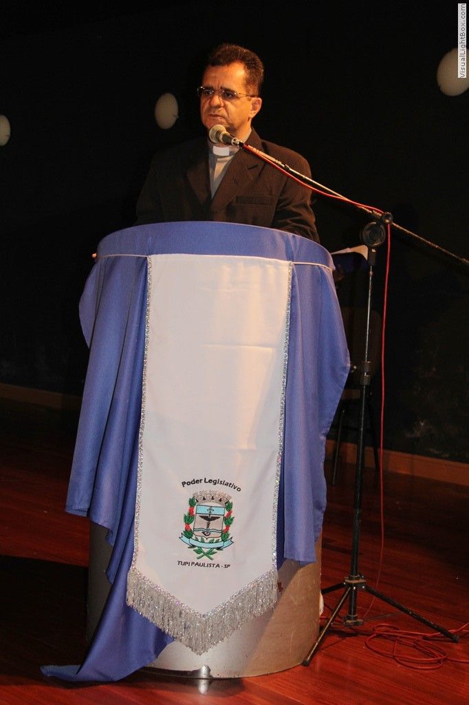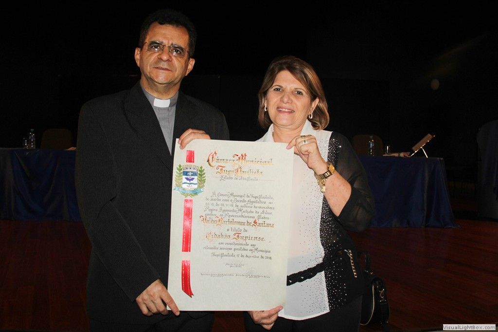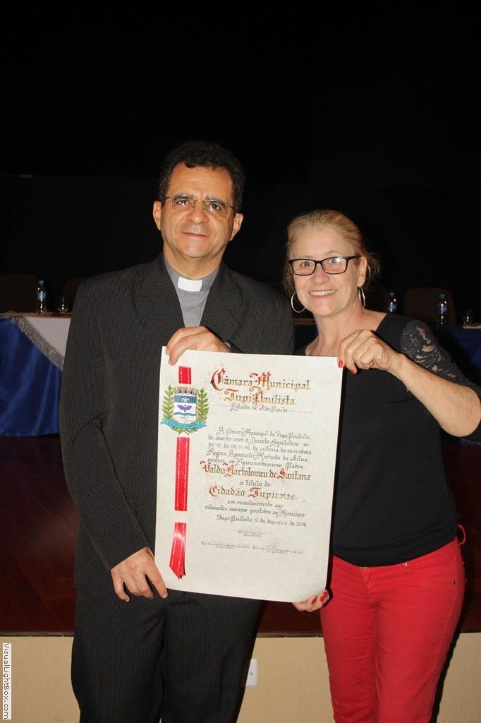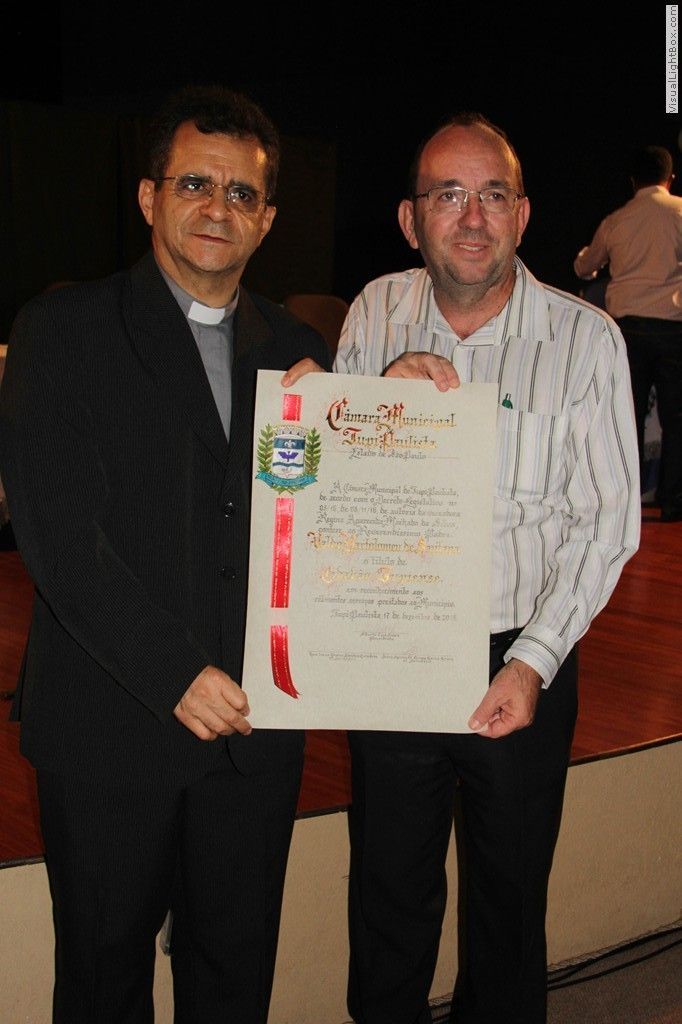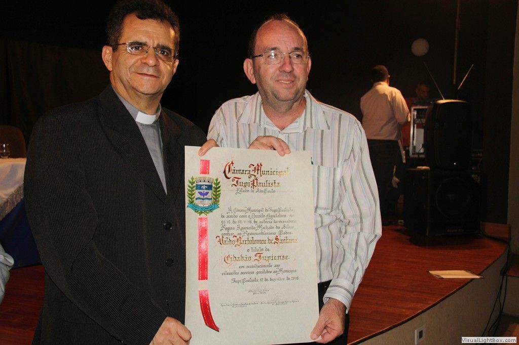 Padre Valdo Bartolomeu de Santana recebeu o "Título de Cidadão Tupiense" pelos relevantes serviços prestados à comunidade, na manhã de sábado, 17, nas dependências do Teatro Municipal "Zanoni Ferrite" de autoria da vereadora Regina Machado.