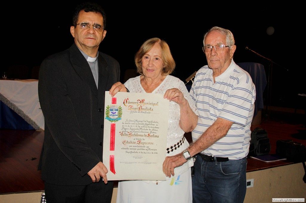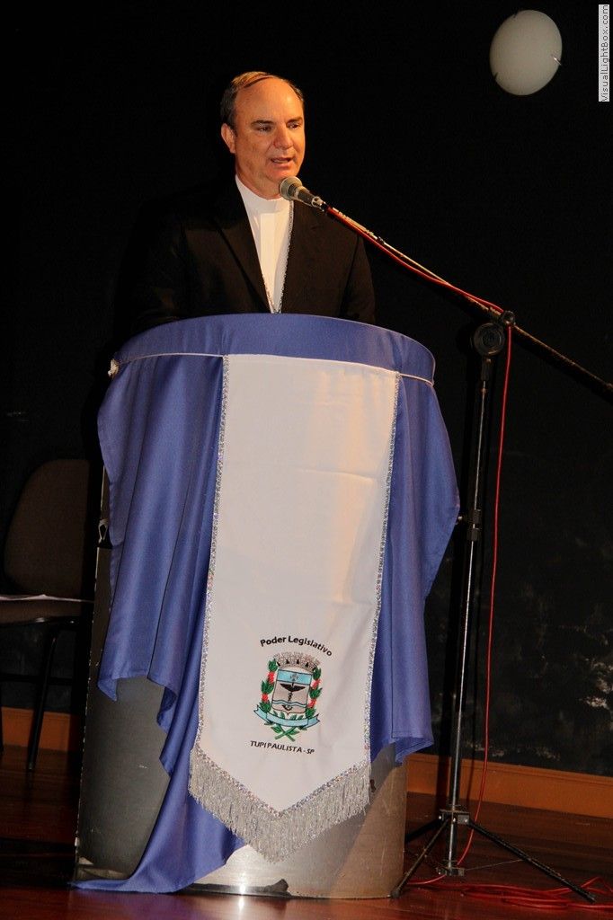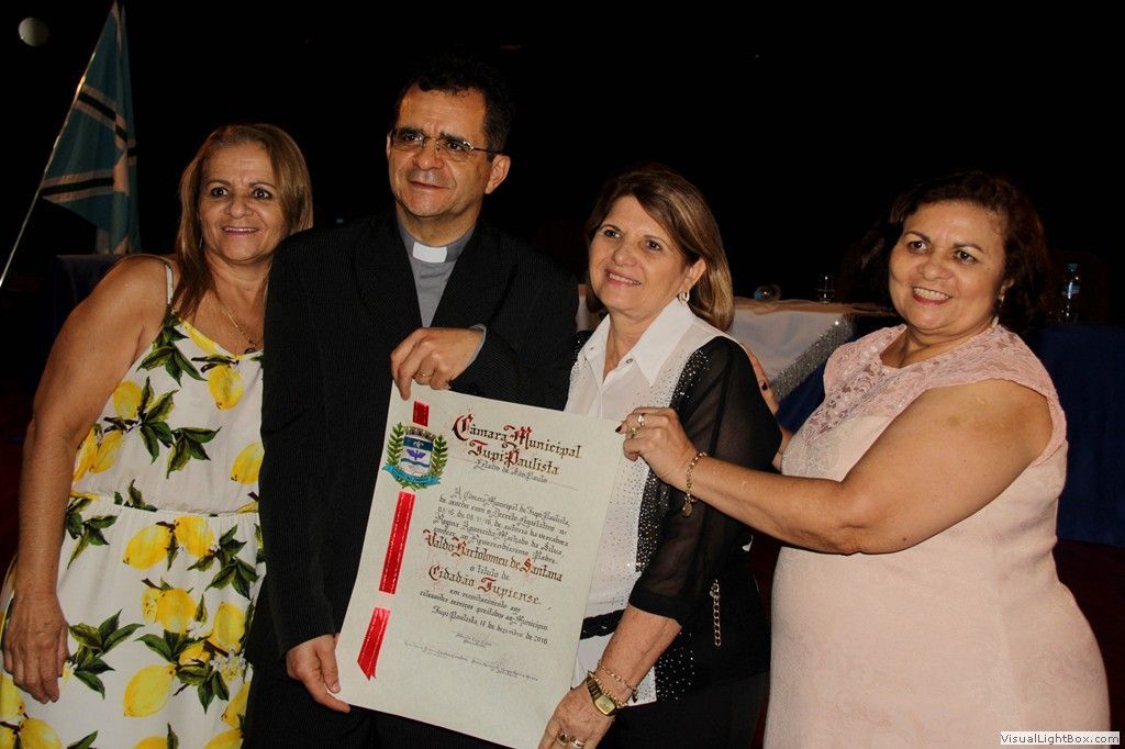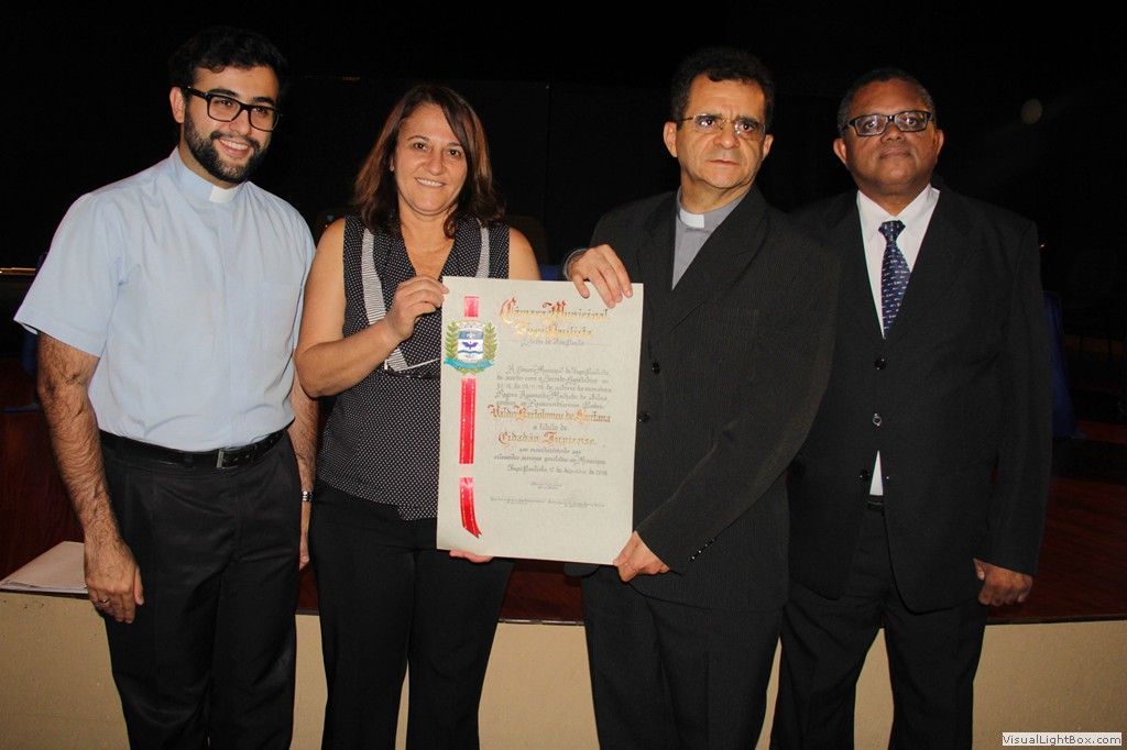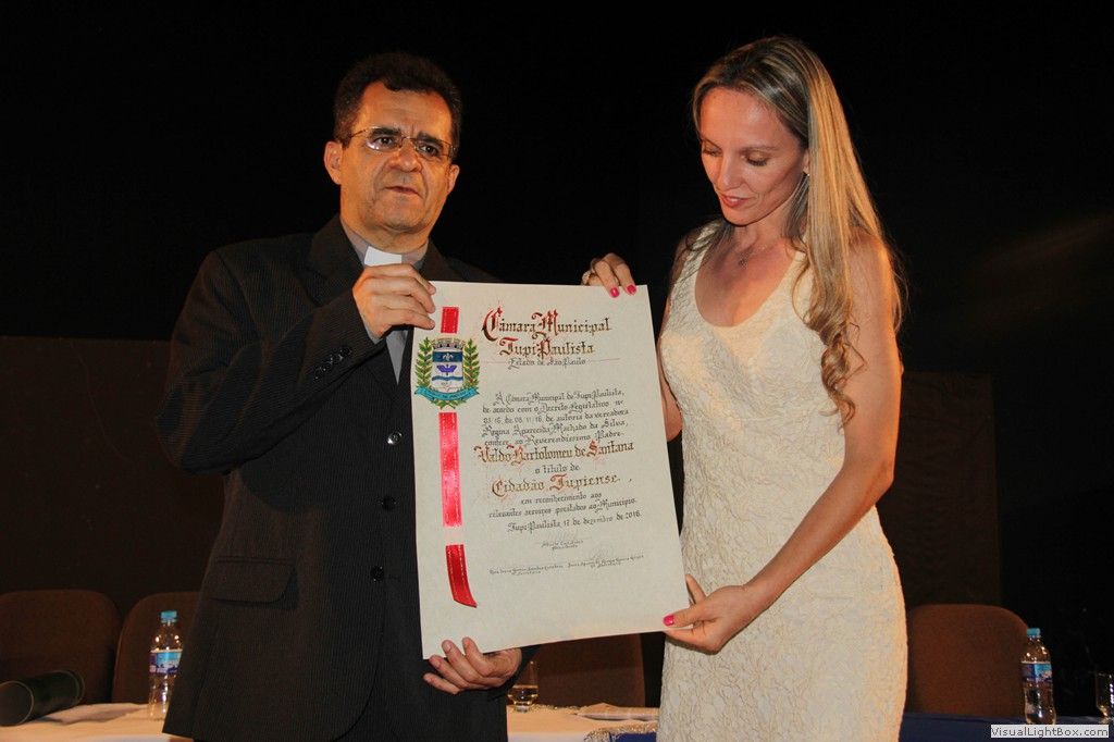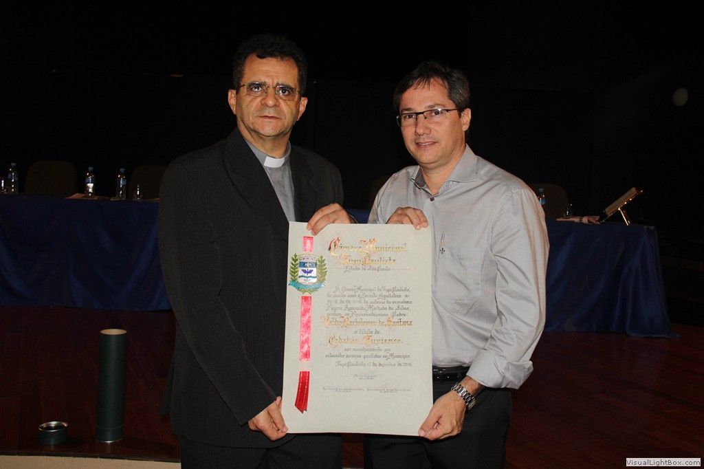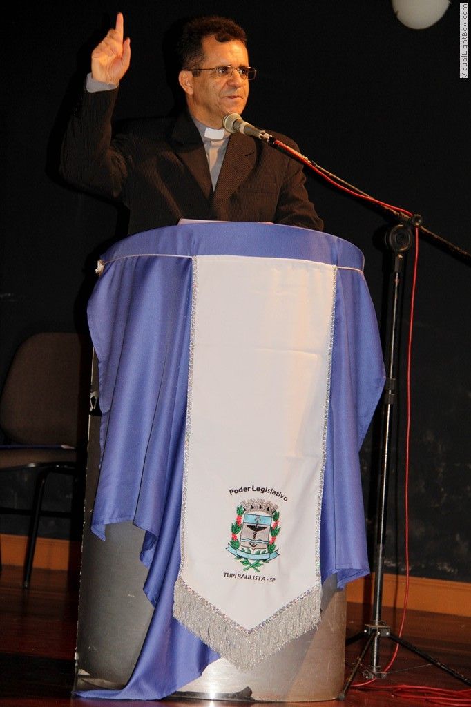 Padre Valdo Bartolomeu de Santana recebeu o "Título de Cidadão Tupiense" pelos relevantes serviços prestados à comunidade, na manhã de sábado, 17, nas dependências do Teatro Municipal "Zanoni Ferrite" de autoria da vereadora Regina Machado.