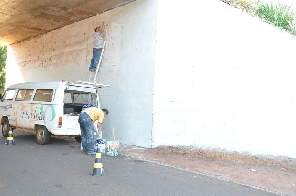 Esta semana os funcionários fizeram a limpeza geral no entorno do trevo, refizeram a sinalização de solo, realizaram a pintura de guias e sarjetas, da imagem da santa e do viaduto.