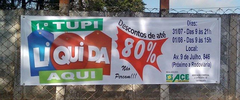 Associação Comercial e Empresarial de Tupi Paulista-ACETP, com a participação de diversas Lojas dos mais variados segmentos prepararam uma Loucura de promoções num só local, é a 1ª Feira Tupi Liquida Aqui com descontos de até 80%.