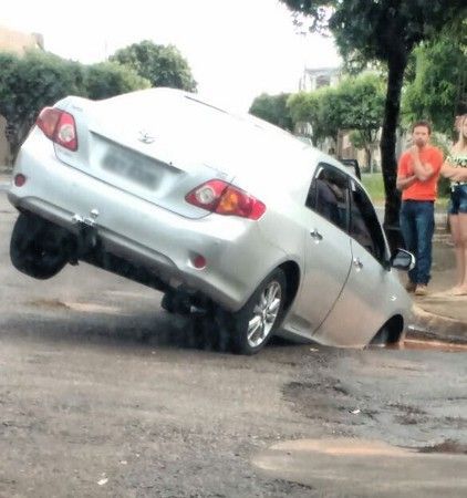 Na tarde de domingo, um condutor que trafegava pela rua Brasília no cruzamento com a rua Três Poderes, no jd. Alvorada teve a roda dianteira do veículo, um Corolla, engolida por um buraco já perto da guia de sarjeta na esquina. Não houve feridos.