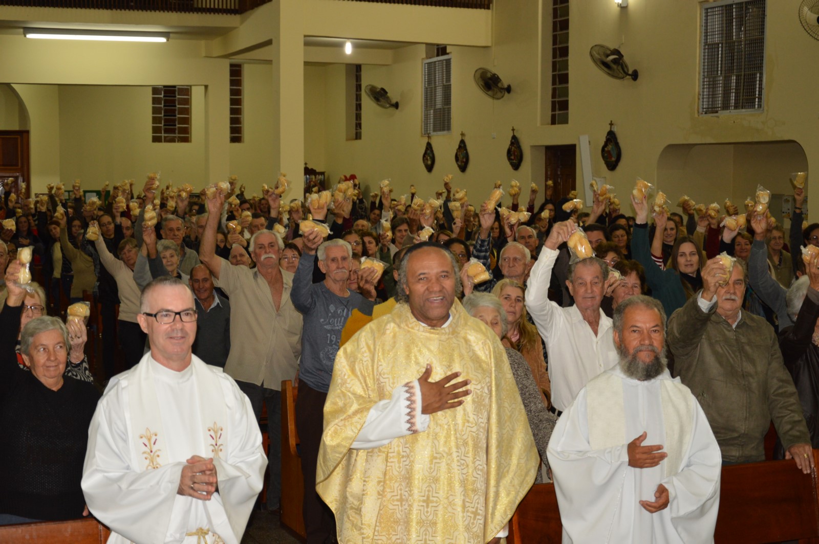 Os antônios e a comunidade foram abençoados e aspergidos com água benta.
