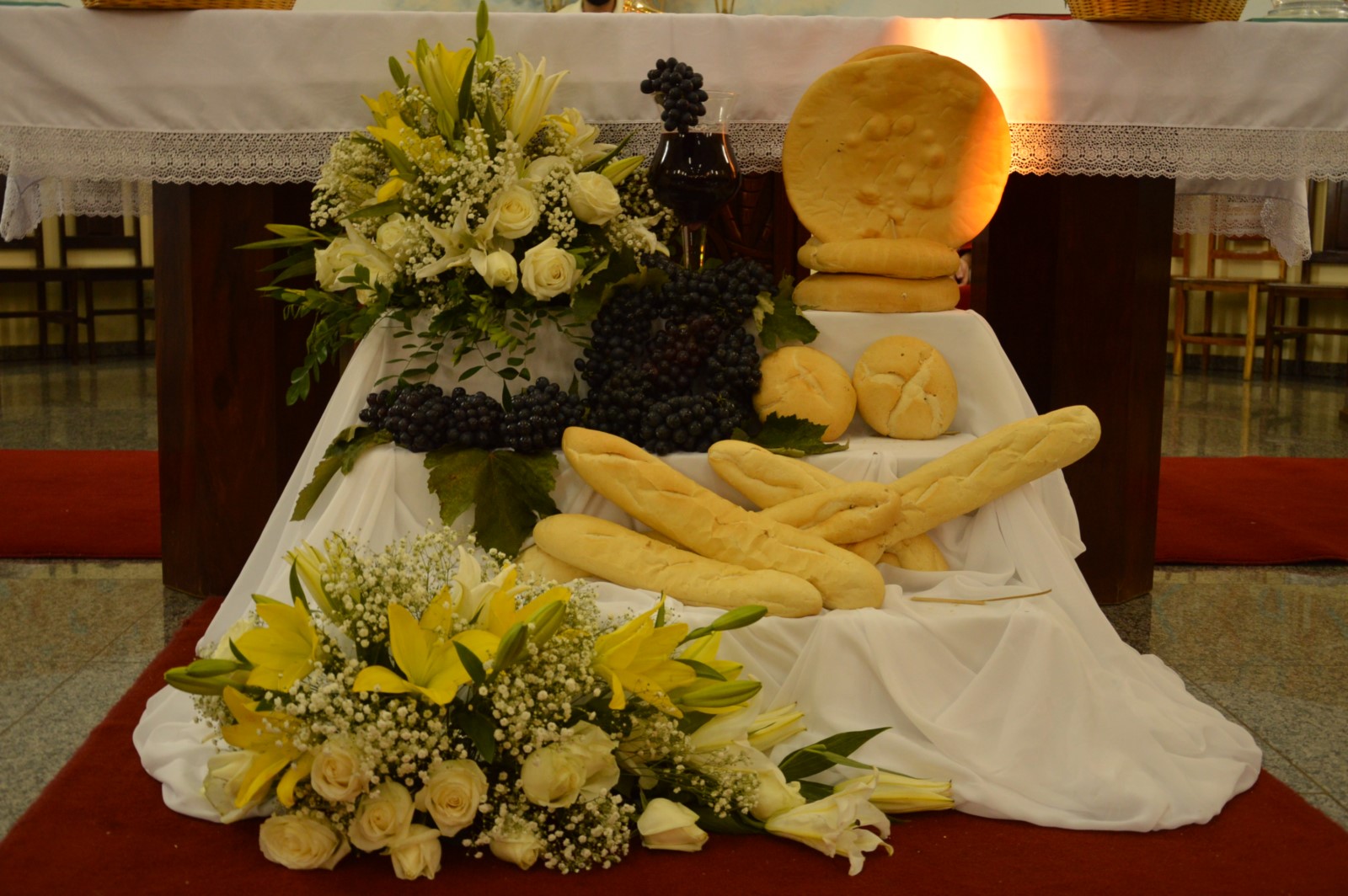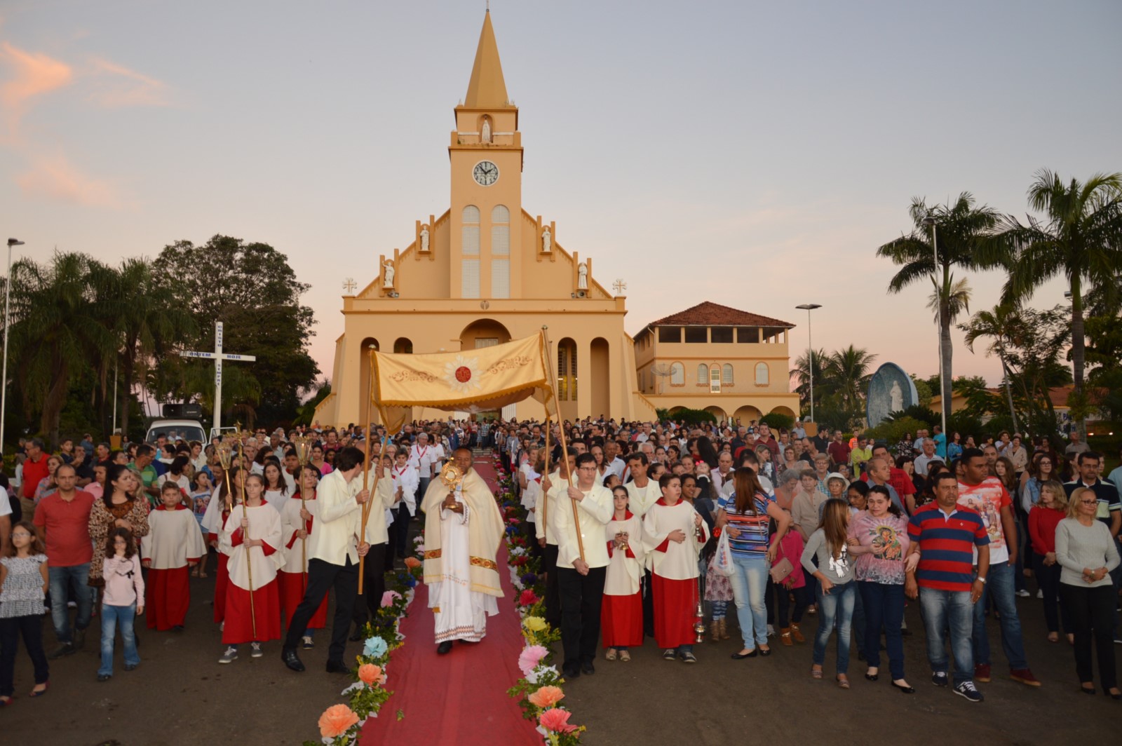 Durante a caminhada foi possível observar o tapete montado pelas pastorais e grupos da paróquia com materiais simples e muito ricos em detalhes artísticos voltados ao tema da Eucaristia celebrada.