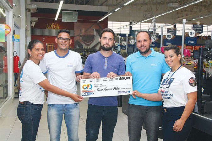 O ganhador Lucas Messias Paduan (ao centro) com a representante comercial do JR, Rafael Braga e equipe do SupermercadoIkeda (Foto: Lucas Mello/JR)