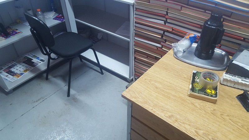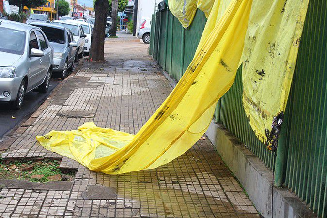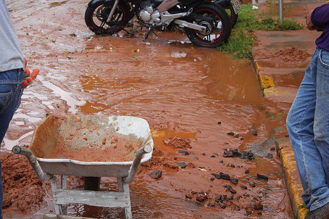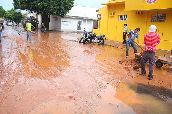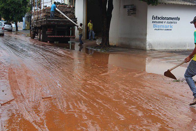 A rua Marechal Rondon, trecho da área central da cidade, ficou coberto por terra devido a uma obra no local. Logo após a chuva, trabalhadores da obra faziam a limpeza da rua.