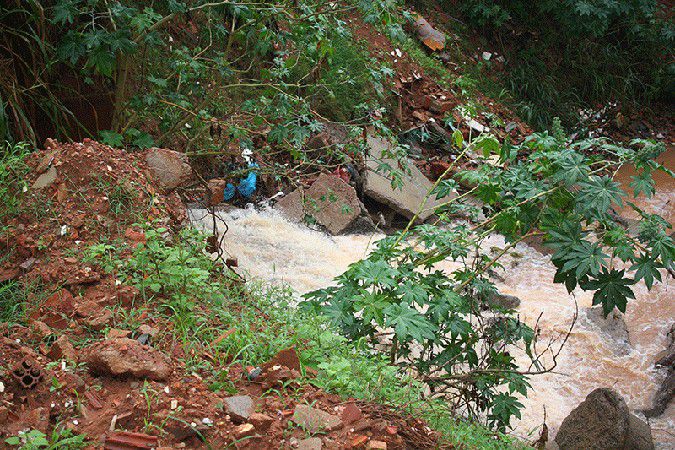 EROSÃO NA MARGINAL - Nas fortes chuvas do começo de 2016, as galerias pluviais no local que davam vazão das águas para o córrego Água Sumida não suportaram o volume das chuvas e se romperam.