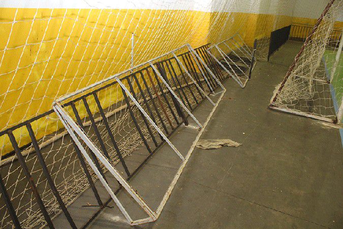 A reportagem flagrou as grades de proteção caídas atrás dos gols, também continuam os parafusos da armação metálica, possibilitando acidentes, fixados no chão. Nos vestiários, são notáveis as infiltrações no teto, bem como os vidros das janelas quebrados.