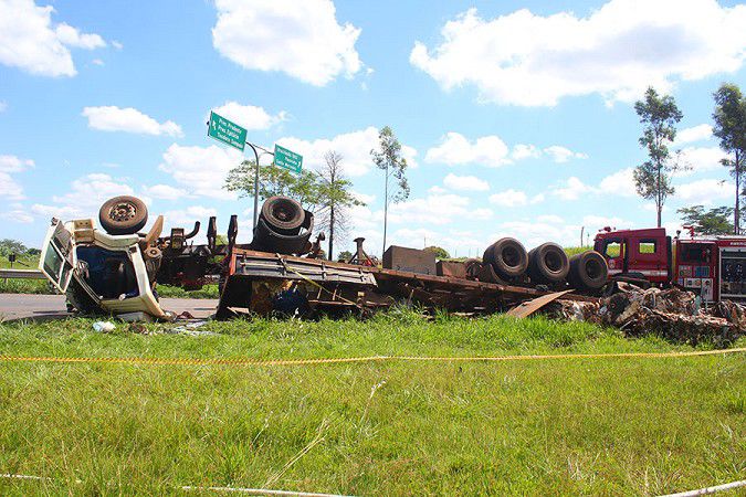 A corporação não soube informar quantas toneladas o veículo transportava. A carga ficou espalhada pelo canteiro do trevo e na pista de rolamento.