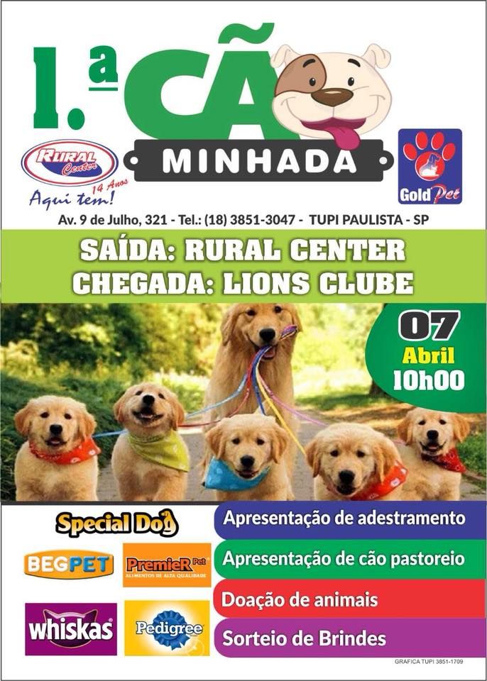 Estaremos esperando você e seu Pet para a 1° Cãominhada no dia 07/04 as 10 horas com saída da RURAL CENTER e chegada no Lions Clube onde serão realizadas as apresentações e sorteios de diversos brindes.
